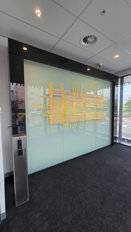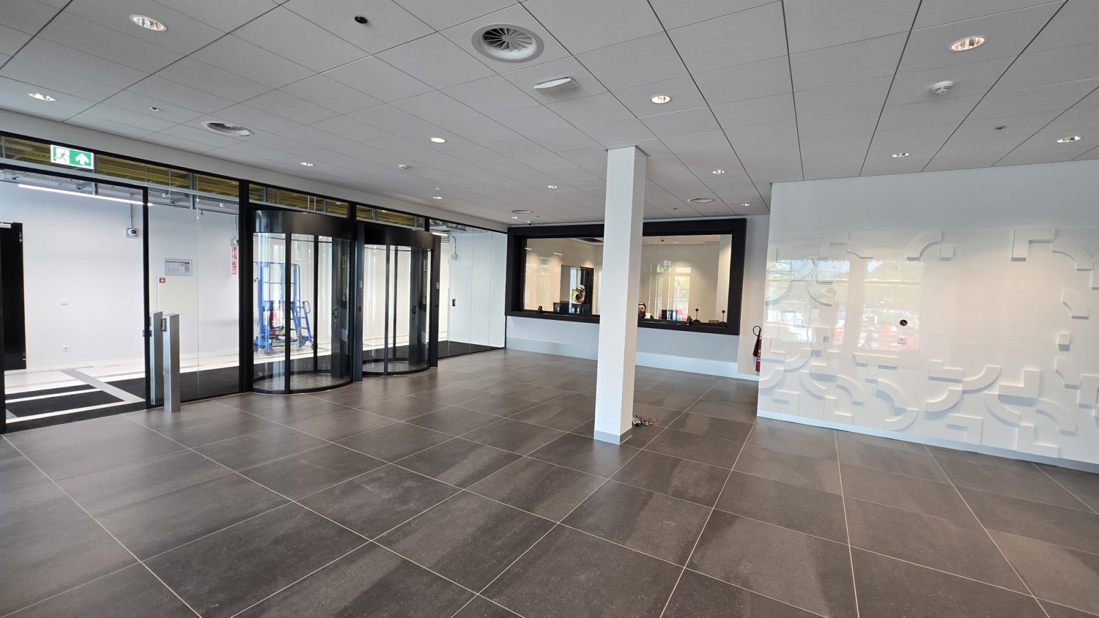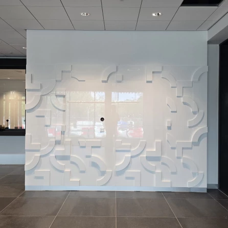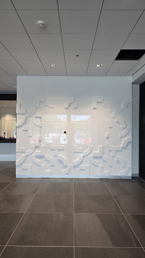 Our team was also responsible for completing finishing works in office spaces, electrical rooms, and halls. In addition, we installed partition walls featuring the company logo as well as a decorative wall that enhances the aesthetics of the lobby waiting area. Both structures were custom-made and meet the highest quality requirements, providing an elegant high-gloss finish.
